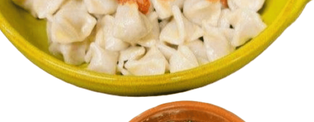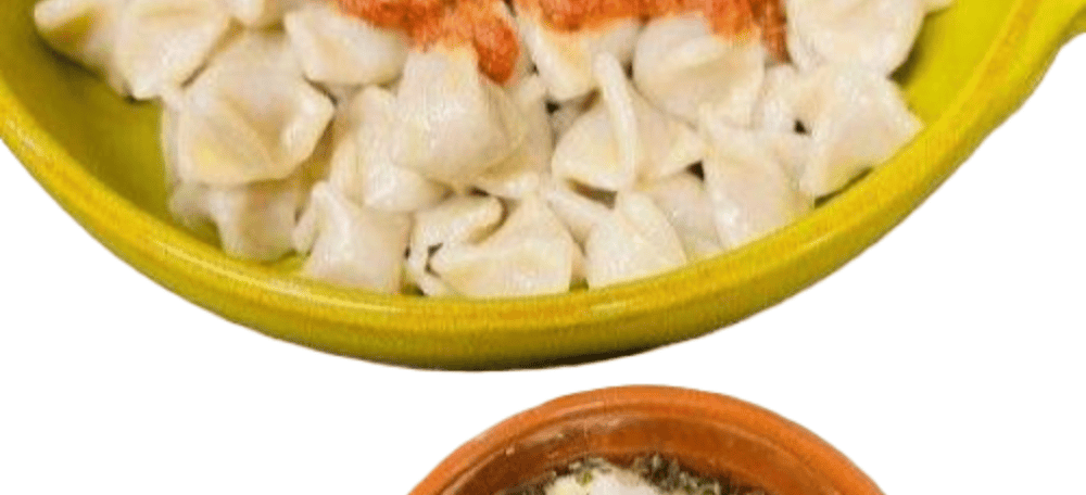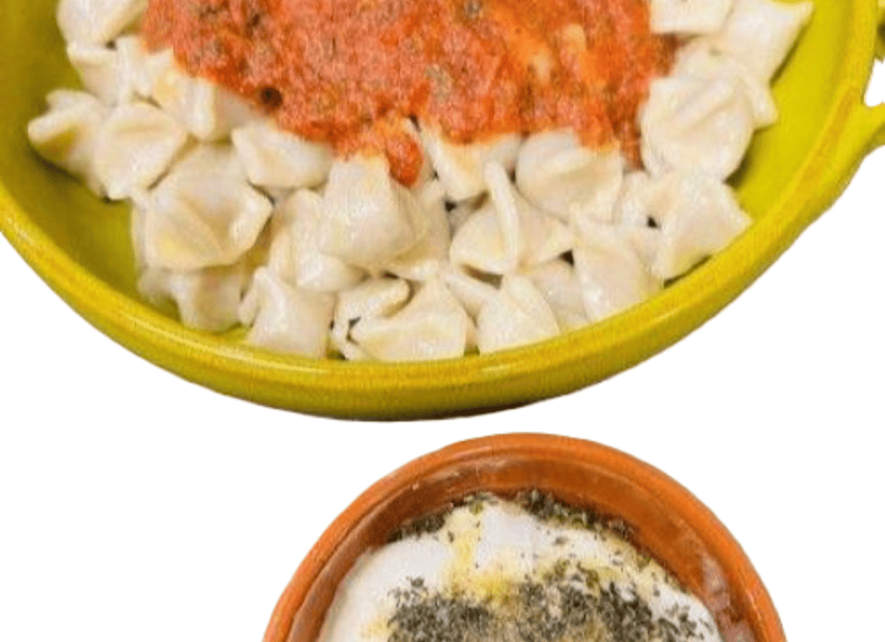 Turkish ravioli with spiced minced meat (beef) and a mild chili dressing - served with creamy yogurt sauce.